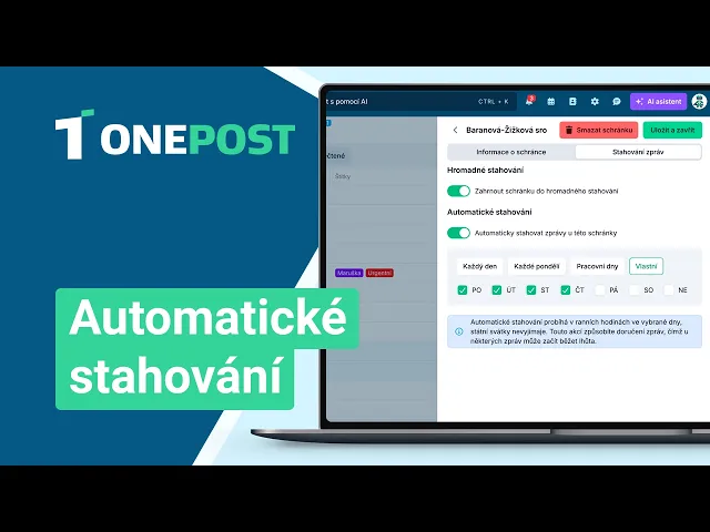 Funkčnost automatického stahování umožnuje stahovat zprávy bez nutnosti kliknutí na tlačítko Přijmout zprávy. Toto je umožněno uživatelům se zakoupeným licenčním modulem Automatické stahování datových zpráv. Uživatel se k nastavení automatického stahování dostane přes Nastavení - Datové schránky - Upravit datovou schránku (ikonka tužky nebo kliknutím na danou schránku) - Stahování zpráv.