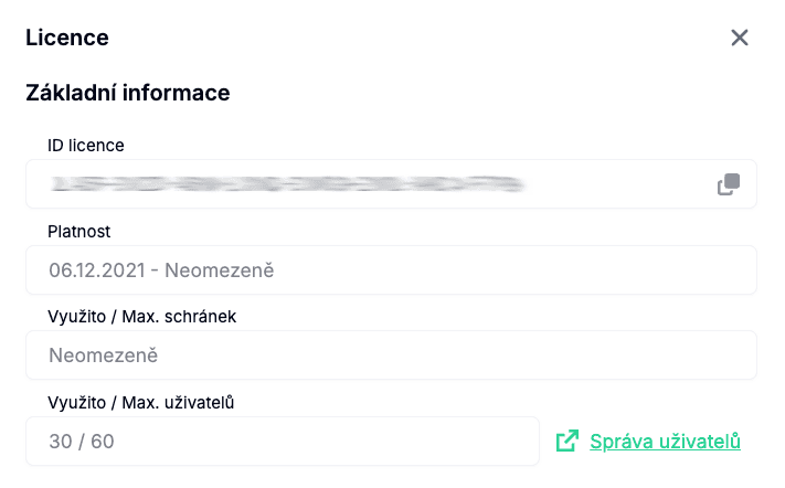Stránka Licence zobrazuje informace o aktuálně aktivní licenci vaší organizace, včetně typu licence, platnosti a rozsahu dostupných funkcí.