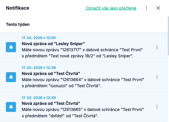 Panel notifikací zobrazuje chronologický seznam oznámení o nových zprávách doručených do vašich datových schránek. Každá notifikace obsahuje informaci o odesílateli, datové schránce, předmětu zprávy a čas doručení.