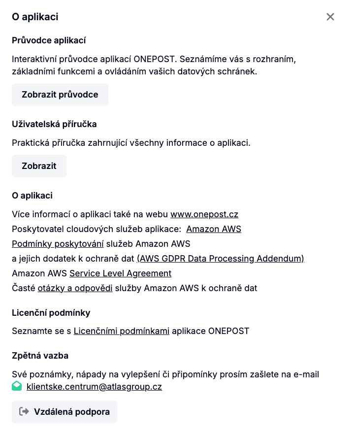 Po kliknutí na ikonu profilu (avatar v pravém horním rohu) a výběrem položky O aplikaci z rozbalovací nabídky se zobrazí informace o aktuální verzi aplikace ONEPOST.