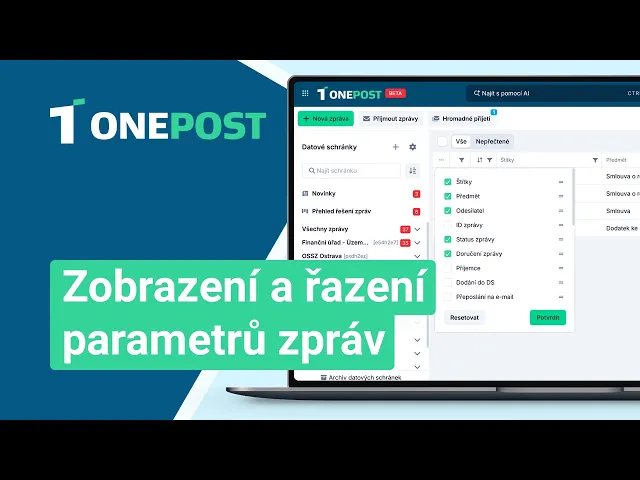 Po přihlášení do aplikace můžete vidět rozdělení obrazovky na dvě hlavní sekce. V levém sloupci naleznete menu s vašimi schránkami. V hlavní části okna naleznete řádkový seznam zpráv se zvolenými metadaty ve sloupcích. ONEPOST umožňuje uživatelsky definovat zobrazené sloupce a jejich pořadí v seznamu zpráv. Pro různé schránky a složek doručených a odeslaných zpráv lze předdefinovat různé výchozí nastavení sloupců, co se týče jejich zobrazení a pořadí.