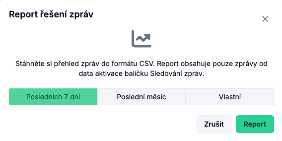 Na stránce Přehled řešení zpráv (dashboard) se v pravém horním rohu nachází tlačítko Report. Po kliknutí se otevře dialog pro generování přehledu řešení zpráv ve formátu CSV.