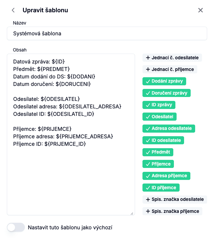 Šablony se následně přiřazují ke konkrétním datovým schránkám nebo pravidlům přeposílání, aby se při automatickém přeposílání zpráv na e-mail použil požadovaný formát.