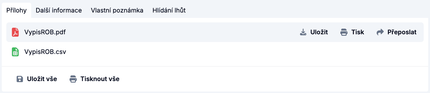 Pod seznamem všech příloh jsou pak k dispozici hromadné akce nad všemi přílohami. Tlačítko “Uložit vše” stáhne všechny přílohy zabalené do ZIP souboru.