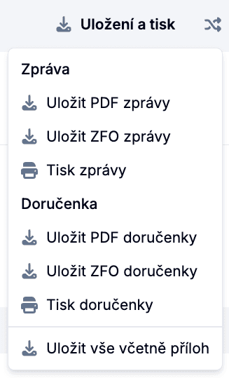 V detailu otevřené zprávy lze pomocí tlačítka “Uložení a tisk” vyvolat nabídku, která umožní stáhnout buď zprávu, nebo doručenku zprávy na místní úložiště buď ve formátu PDF, nebo ZFO. Ze stejné nabídky lze vyvolat tisk zprávy/doručenky, který otevře tiskový příklad vašeho internetového prohlížeče.